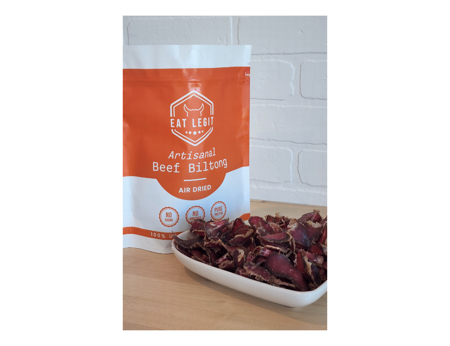 Indulge in a delectable treat that embraces nature's flavors! Experience the irresistible allure of our handcrafted Beef Biltong. Sourced from 100% grass-fed beef, this protein-rich snack is a burst of tantalizing taste. Whether you're satisfying a craving or seeking a wholesome snack, our Artisanal Beef Biltong is the perfect choice.